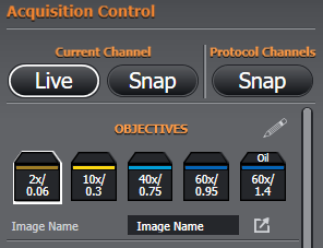 Switch between objectives. The values displayed for each objective are magnification and numerical aperture. Hovering over an objective will display a tooltip with further information. When switching to or from an oil objective, Fusion will prompt you you add or remove oil from the objective. For more information see Oil Objectives.