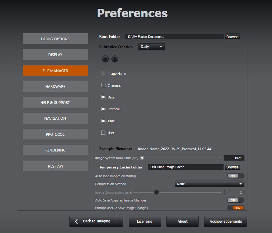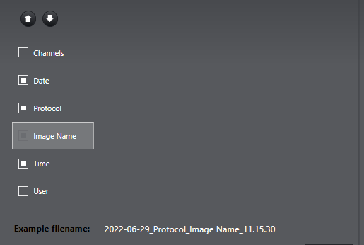 Default: Daily folder creation, Date, Protocol and Time prefix options selected and a prefix of "Image Name" which cannot be deselected but can be moved to change the location within the file name. Each prefix can be moved to suit the user.
