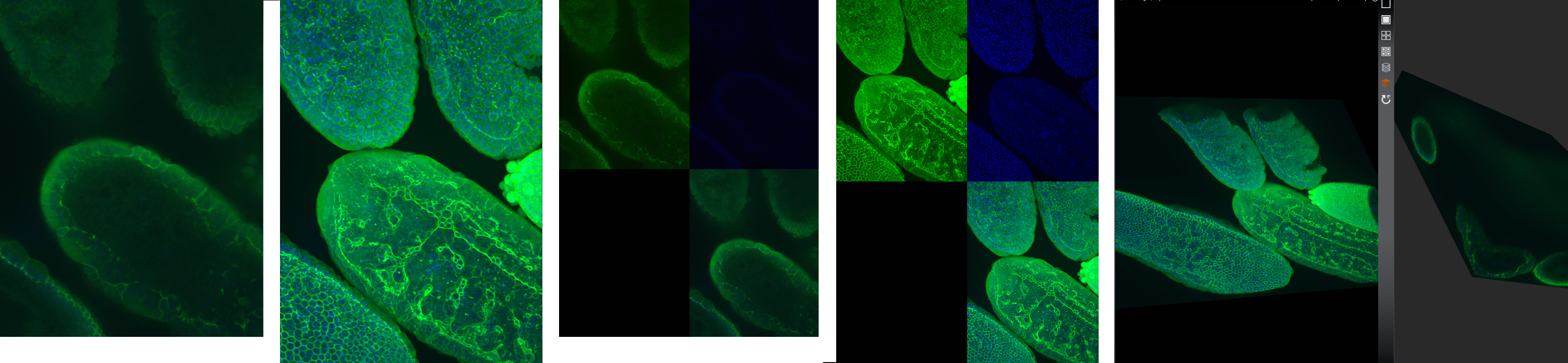 | 2D Split Channel MIP Mode | Up to 3 channels and a combined multi-channel view through a Z-stack by rendering the brightest voxels for a specific time point as 4 quadrants |