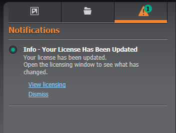 Fusion will check for pending updates upon startup. If an update has been applied, a notification will be created to inform you that your license has been changed.