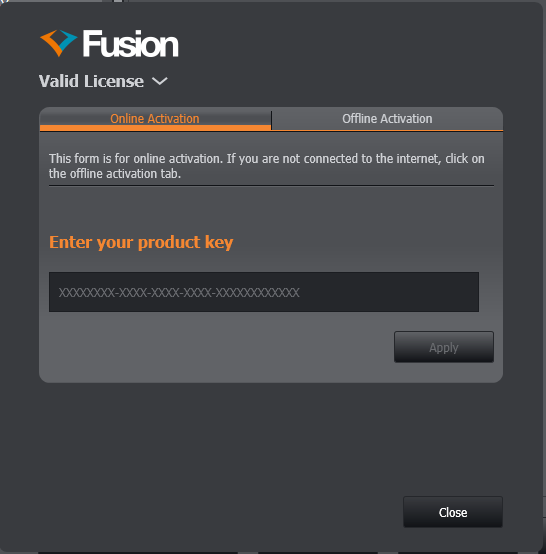 When first running Fusion you will be asked to activate your license. To do this you’ll need your product key which was provided along with your purchase (if you don't possess a product key please contact Support)