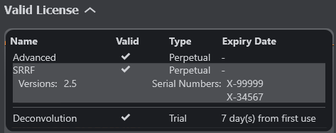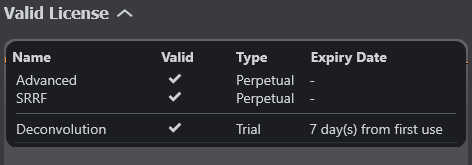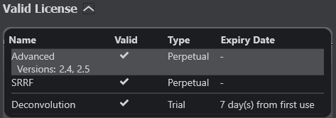 To see the currently installed license, click on the drop-down arrow. This will provide the following information on which features are available: