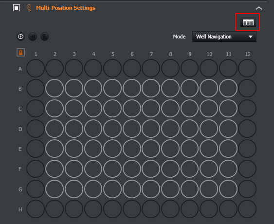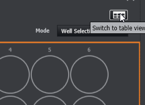 The user can work using the well plate interface displayed. Alternatively, by clicking on the table button (highlighted), the user can go toNavigation in Table View.