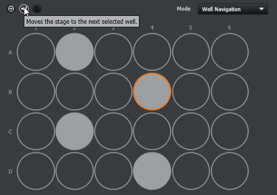 Clicking this button will navigate the stage to the next selected well. This is based on the acquisition order, which can be checked by using the table view.