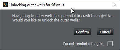 For Well plates with more than 96 wells, there is a potential objective crash hazard in the outer wells, especially at higher magnifications. These wells are locked for navigation by default, but can be unlocked if required.