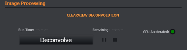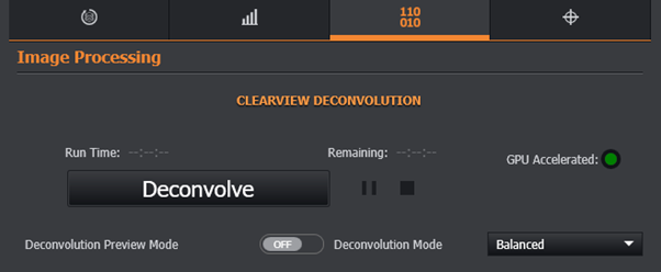 - View and configure the Deconvolution settings as required. Refer to the section Image Processing Tab for further information.