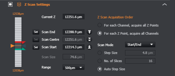 Set the Z Scan acquisition order and the Scan Mode (Start/End or Centre/Size).