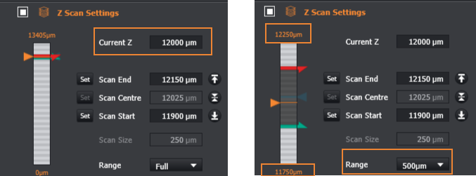 Example: In this example, our current position is 12000um and we are going to select a range of 500um. You will then see that the slider bar has updated and is now representing values from 11750um - 12250um, this makes the start/end/centre sliders much more useful as we can click and drag them to tweak the values if necessary.