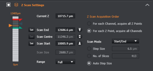 Define the Z scan by defining the size of the scan. Define the centre of the acquisition first then by adjusting either start or end markers an overall scan size is defined.