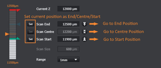 Current Z: This is the current Z position of the system, you can manually type a value in this textbox or use the orange arrow on the left of the slider to click and drag to move the Z stage.