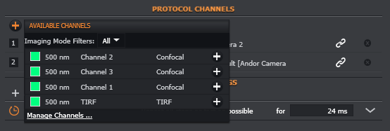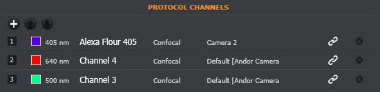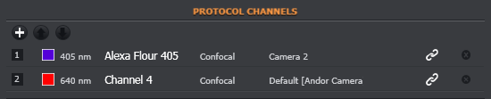 All channels that have been created are available to add to the current protocol. To add a channel to a protocol: