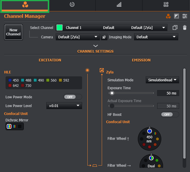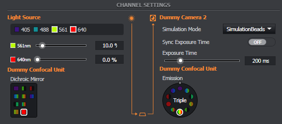 Channel settings displays the channel information in a logical order from light source, filter settings of the confocal unit and camera exposure.