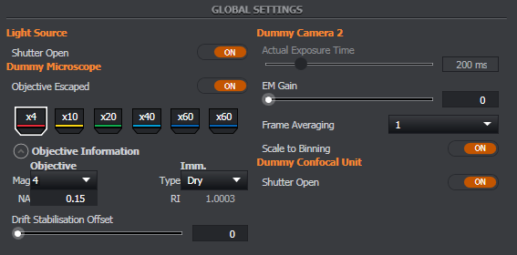 Light Source: The available laser wavelengths are listed. Each laser line source can be selected as required, intensity can be set using the slider bars or entered directly as % of maximum power. Dragonfly offer 2 laser engines; ILE (Integrated Laser Engines) and HLE (HLE & VLE - High-Powered Laser Engine & Versatile Laser Engine).