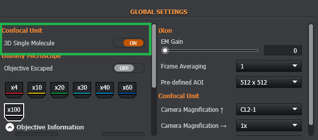 Engage the 3D super-resolution module - the 3D Single Molecule is switched on within Confocal Unit global settings within the channel manager.