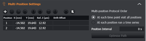 This section shows how to create a Multi-Position and Multi-Position without Z-scan (no-Z) protocol. Setting the protocol type to Multi-Position enables field positions to be entered.