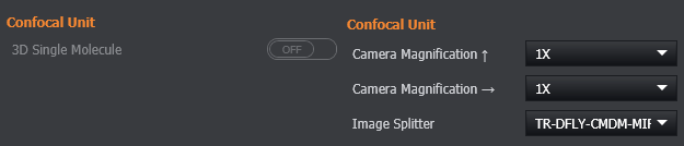 Camera Magnification - If fitted (motorised 3-postion on 300/500 series, optional 2-position on 200 series), the camera magnification for each camera can be selected. Fusion will automatically adjust the pixel size as appropriate. Higher magnification provides higher XY resolution at the cost of image intensity (because the photons are being spread over a larger area on the camera sensor). This is especially useful when using Deconvolution.
