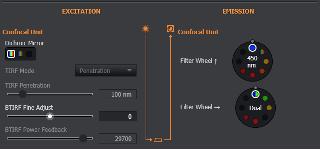 Filter Wheels - The emission filter selected for the secondary (vertical port on 300/500 series, right camera port on 200 series, if applicable) and primary (horizontal port on 300/500 series, left camera port on 200 series).
