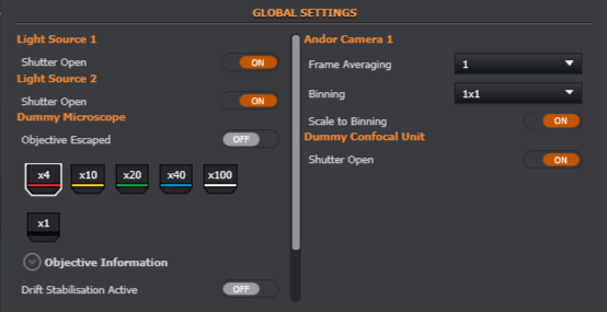 Global settings are the next most frequently accessed properties and include things like laser shutter status, microscope features such as Escape and objective selection, followed by camera binning, region of interest and so on. They can be varied independently of any other settings in the system, and are arranged to have rapid access.