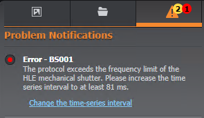 If running a multi-channel acquisition (with a high-powered mechanical shutter laser on only one channel) and the acquisition speed exceeds the frequency limit of the HLE mechanical shutter, the acquisition will be blocked and the user will be informed by an error notification in the Problem Notification Panel. A problem resolution will be provided to allow the user to proceed with the acquisition by increasing the time interval to be above the acquisition limit threshold.