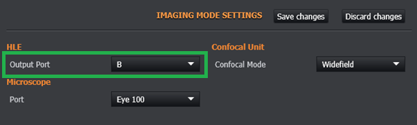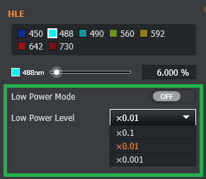 When using the HLE/VLE, ensure Output Port B is selected in Imaging Mode Settings. Once this output port is selected, you can avail of the attenuation options available (×0.1, ×0.01, ×0.001) which will be applied to the laser intensity when low power mode is turned on.