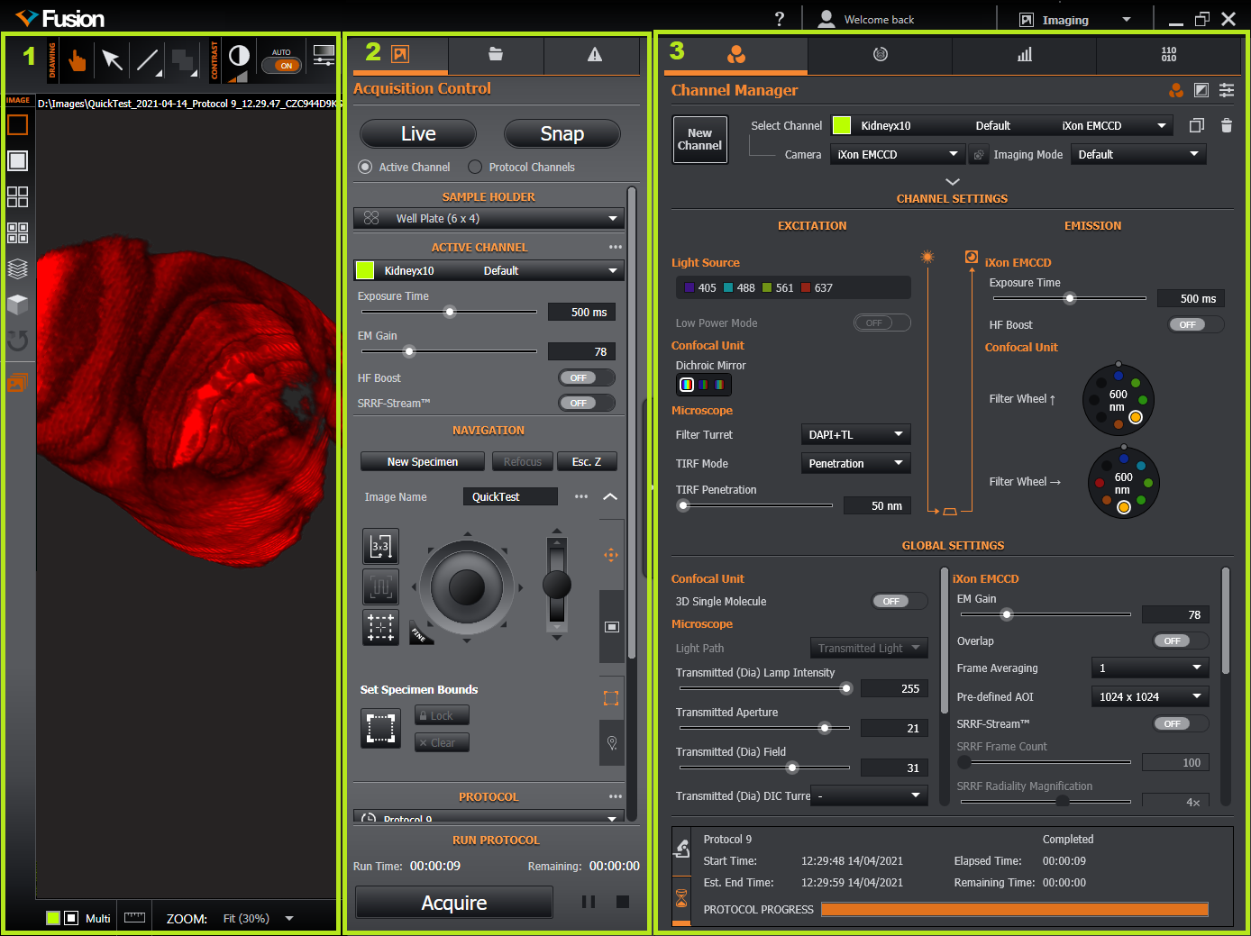 The imaging Workspace provides access to the various protocol, channel and image settings required for configuring and running your imaging experiments.