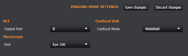 A custom imaging mode can be created, or an existing mode can be edited from the Imaging Mode Manager Panel. To edit an imaging mode click Edit Settings. Modify the settings as required and then click Save changes once complete, or Discard changes to keep the previous values.