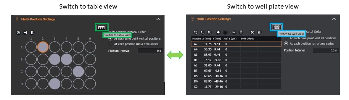 - Multiwell positions can also be combined with other protocol features such as time series, Z scan, montage, drift stabilization settings, image processing and loop options.