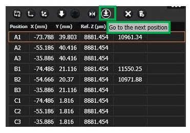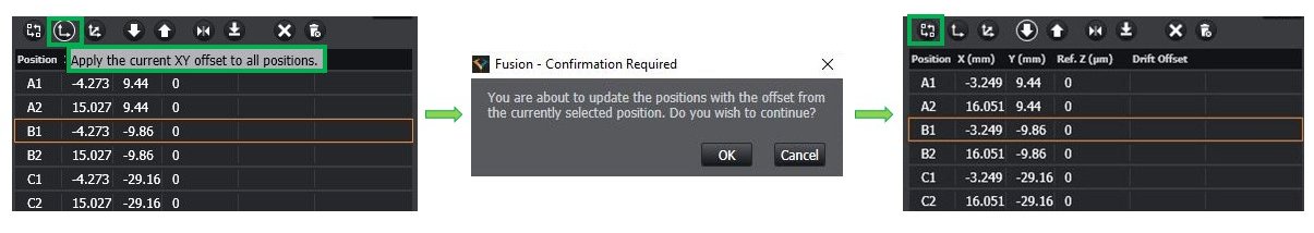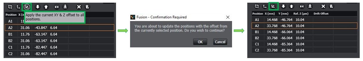 - By clicking on "apply the current XY&Z offset to all positions" (highlighted in green) all positions were updated in X by 2.788 um, in Y by-2.917 um and in Z by 3.4 um.