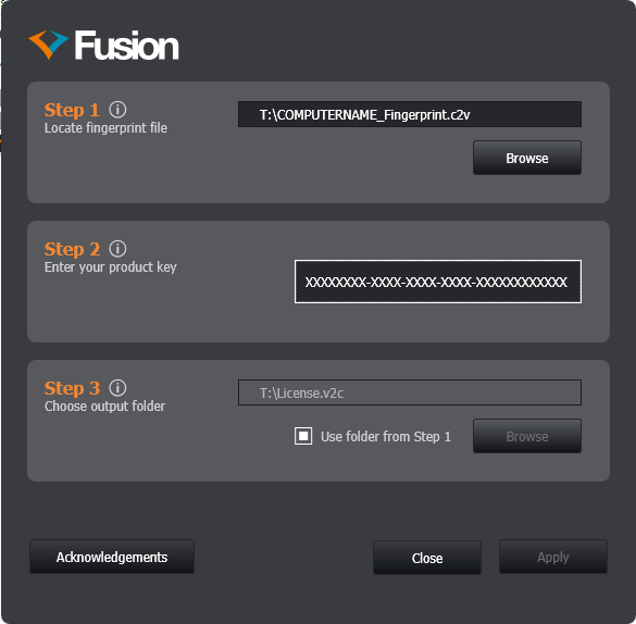 Move the license file (.v2c) to the computer with Fusion installed (where you generated the fingerprint).