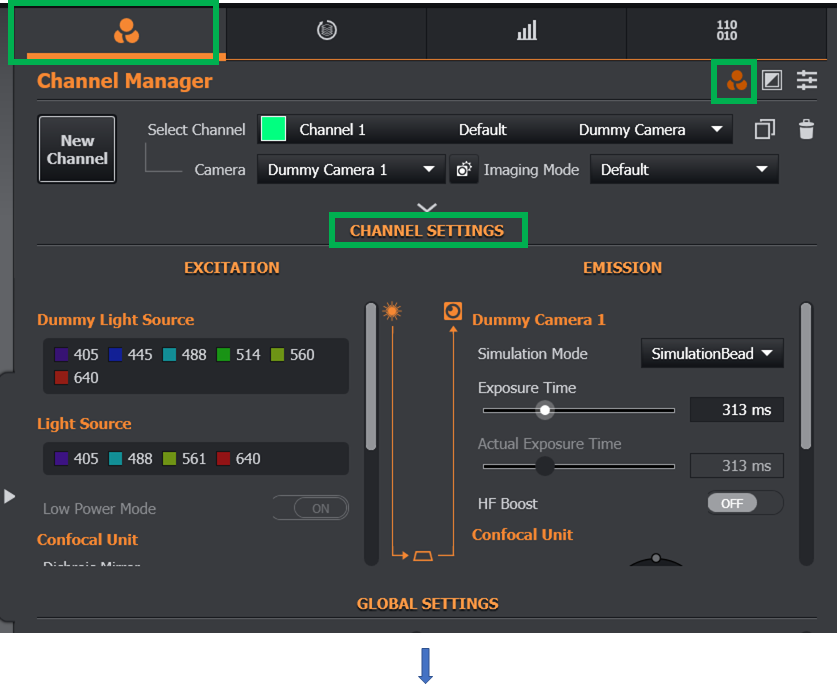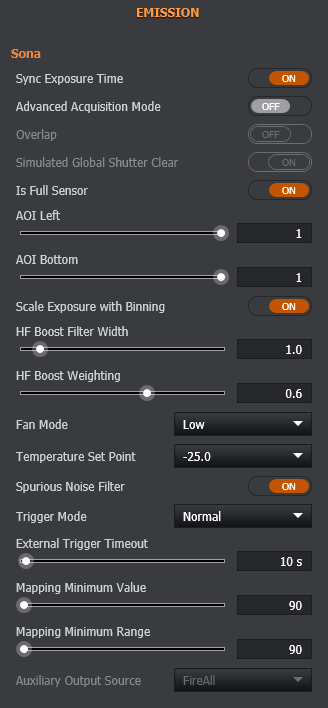 As described in the Image Mode and Feature Location section, device settings can be moved between Channel, Global, Image Mode and Advanced. Therefore, the settings described here may be found in a different location depending on the customisation / user of your Fusion installation. Note that some settings available will depend on the specific model of Sona camera present.