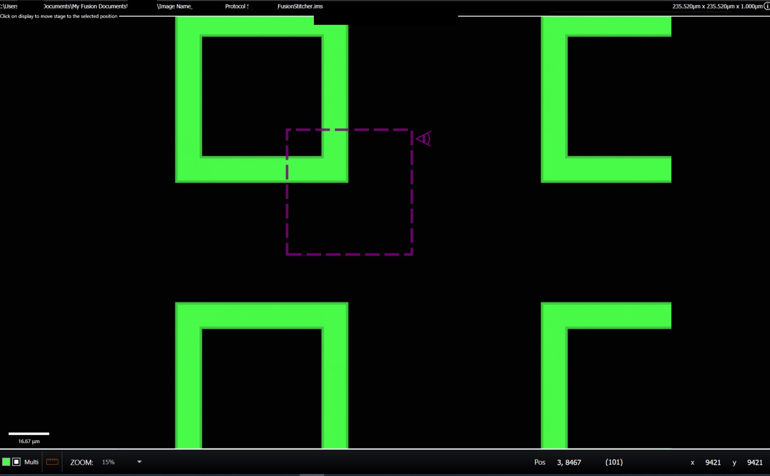 Set bounds for the top left and bottom right corners of the image. Once that has been done, a sub-window will appear to highlight the current position of the stage within the set bounds to aid navigation and orientation of position for the specimen.