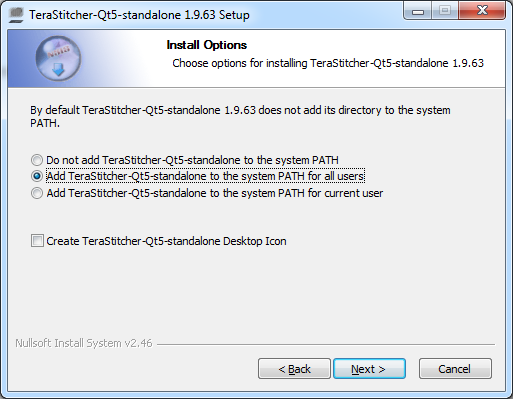 The recommended package to install is Terastitcher-installer with GUI as it offers an option to add the binary folder to the PATH environment variable as shown below: